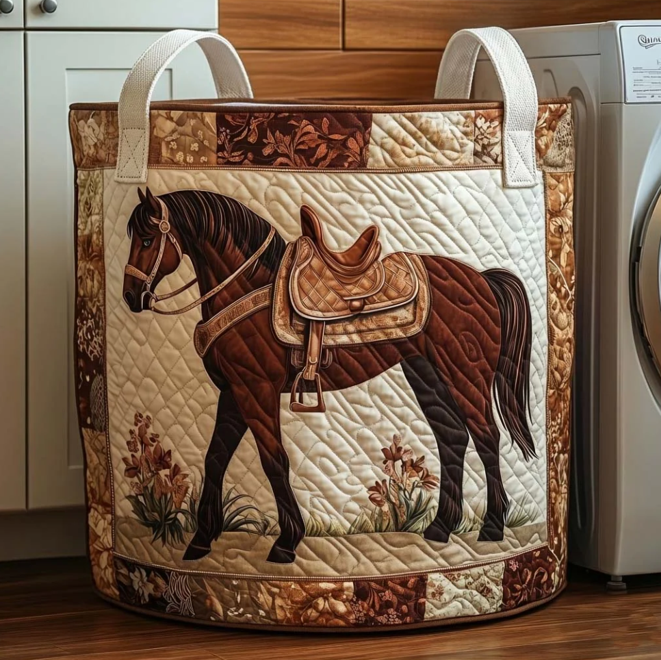 Artistic Galloping Horse Pattern Quilted Laundry Basket Eco-Friendly Machine Washable Storage Bin for Home Rustic Countryside Decor Organization | Horse