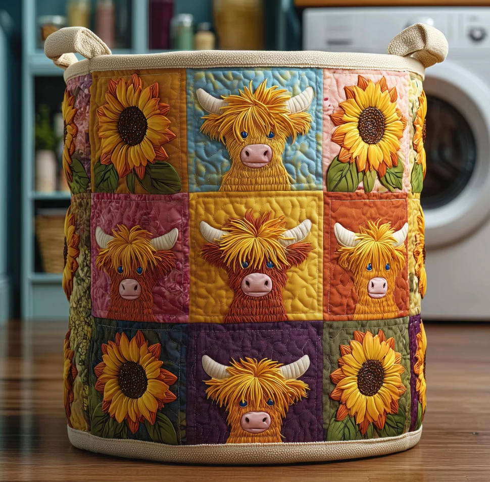 Charming Highland Cow Patchwork Pattern Quilted Laundry Basket Eco-Friendly Machine Washable Storage Bin for Home Farmhouse Decor Organization | Cow