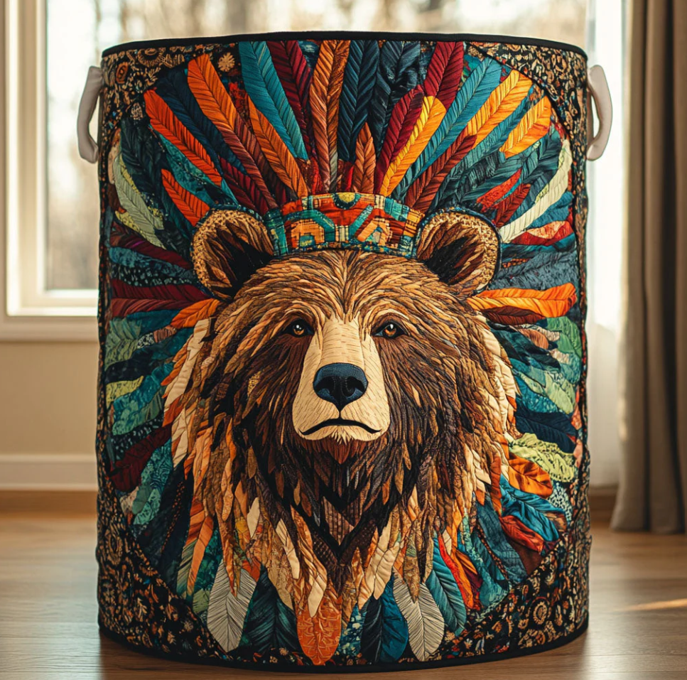 Vibrant Tribal Bear Pattern Quilted Laundry Basket Eco-Friendly Machine Washable Storage Bin for Home Rustic Cabin Decor Organization | Bear