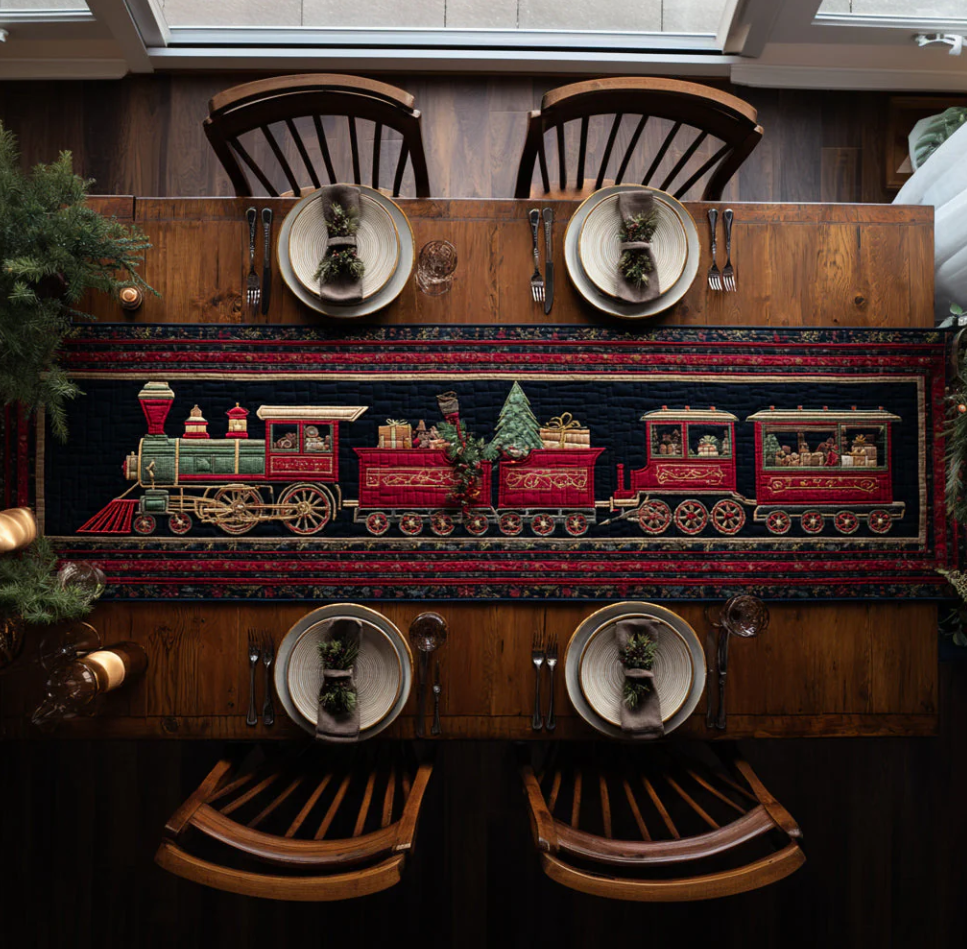 Vibrant Artistic Quilted Table Runner with Chicken Cat Train Ethnic Themed Colorful Pattern Soft Durable Fabric Decor Mat for Dining & Home Decoration