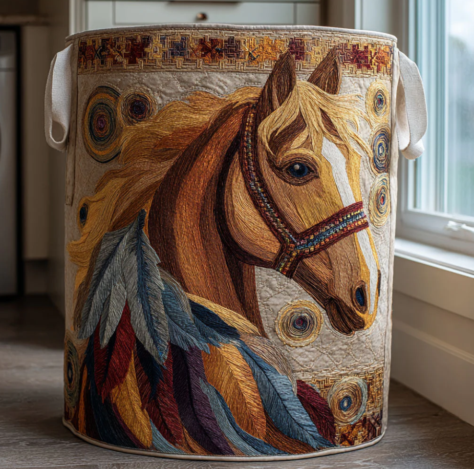 Artistic Galloping Horse Pattern Quilted Laundry Basket Eco-Friendly Machine Washable Storage Bin for Home Rustic Countryside Decor Organization | Horse