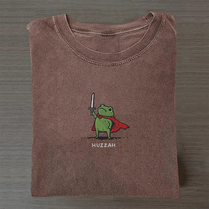 Huzzah Frog Embroidered Tee – Whimsical Knight-Inspired Minimal Art