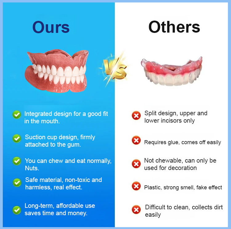 😍No glue required, installs in 1 second. Perfectly fits your mouth. Whether you have a full set of teeth, partially missing teeth, or no teeth at all, they'll fit perfectly.