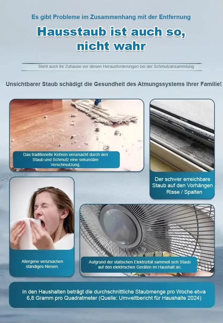 ✨ Schnell & effektiv – Bindet feine Staubpartikel in der Luft und reduziert so sichtbare Ablagerungen auf Möbeln und Böden.